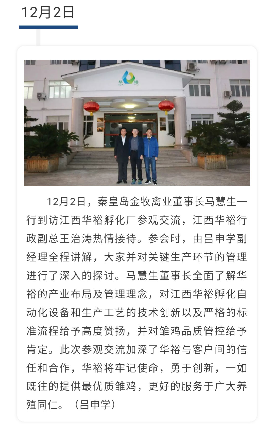 【一周快報】秦皇島金牧禽業董事長馬慧生到訪江西華裕